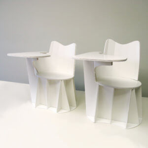 Dozens of alternative ideas were sketched, and CAD modeled to derive the best design. Eventually, a simple split between the upper desk and lower seat base proved to be the most elegant desk design solution. The concept required additional detailing throughout the remainder of the next phase before it was finally resolved.
